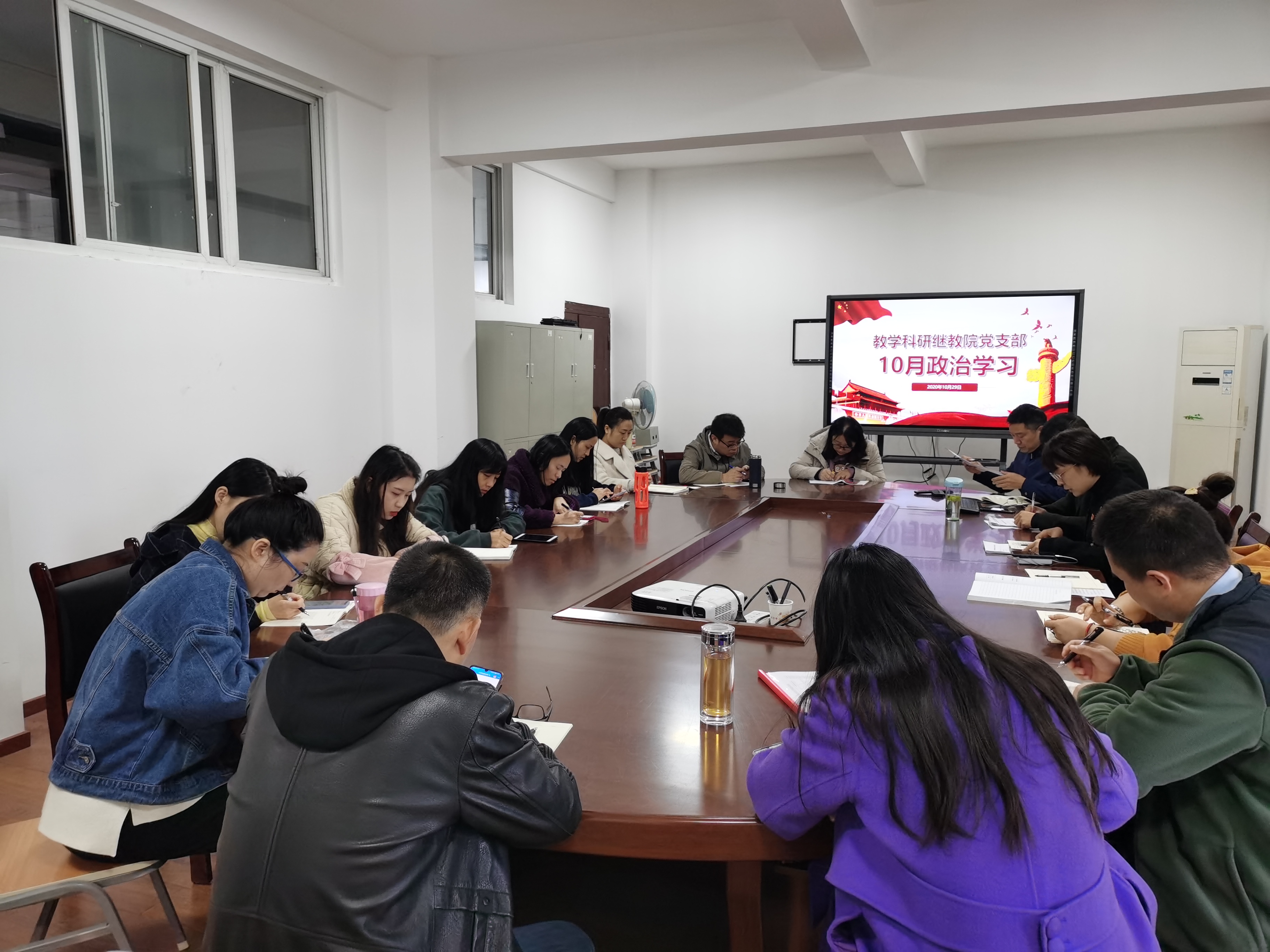 2020年10月29日上午9点,教学科研继教院党支部在文华楼209会议室召开了10月政治学习,会议由李鸿雁同志主持,教学工作部、科研处、tyc1286太阳成集团全体人员参加。