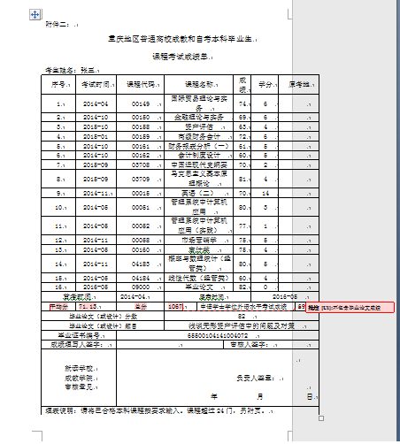 注:总分和平均分不含毕业论文成绩,格式详见下方(三、成绩样表)